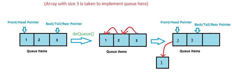 deQueue( item )- This operation is performed on the element pointed by the rear pointer. Once we remove the item from the queue the place in the array is vacant with no use. So to use that vacant place it is necessary to shift other following elements towards rear pointer. Due to shifting of the elements time complexity of this operation is O(n). Below figure demonstrates the same: